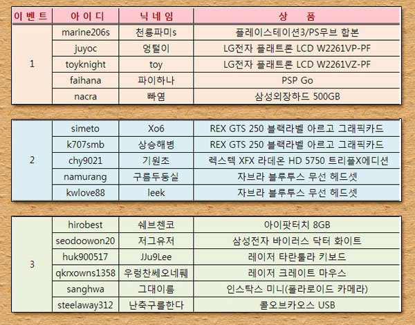 드디어 기다리시던 게임조선 창간 11주년 기념 이벤트(game.chosun.com/event/20100909/evt.php) 당첨자 발표일인 10월 1일 입니다.