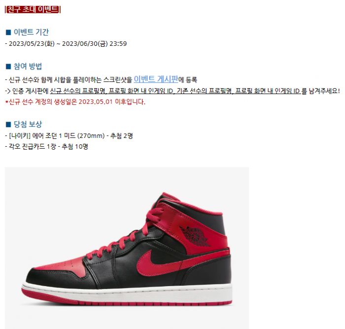 경품으로는 나이키 에어 조던 1 미드(270mm)와 추첨을 통해 10인에게 '각오 진급카드 1장' 이 준비되어 있습니다!