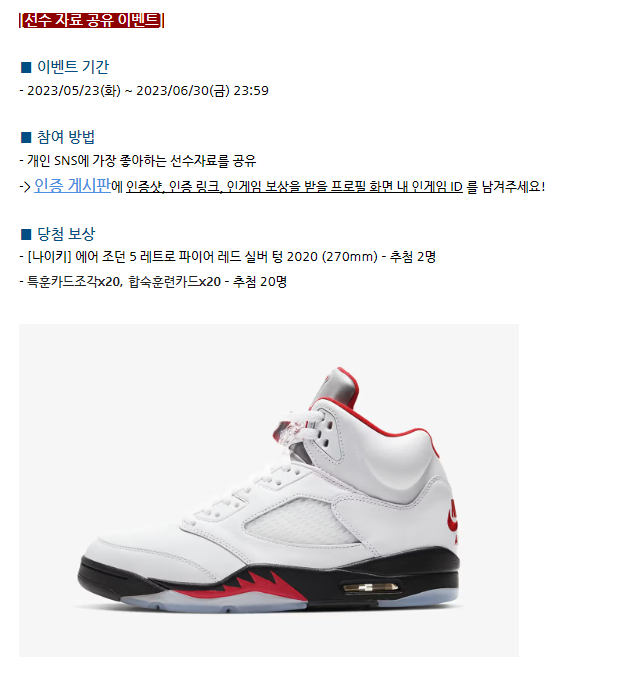 본 이벤트의 경품으로는 나이키 에어 조던 5 레트로 파이어 레드 실버 텅 2020 (270mm) 그리고 추첨을 통해 20인에게 '특훈카드조각X20, 합숙훈련카드X20' 를 증정한다고 합니다.