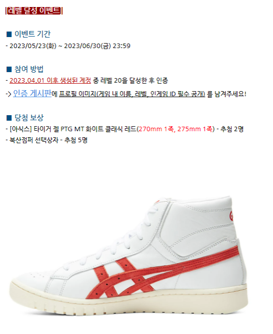 경품으로는 아식스 타이거 젤 PTG MT 클래식 레드(270mm), 추첨을 통해 5인에게 인게임 보상 북산점퍼 선택상자를 증정한다고 합니다!