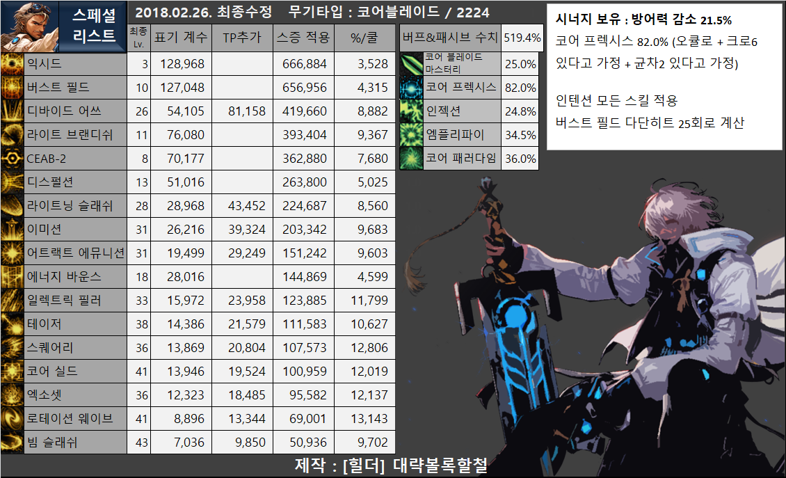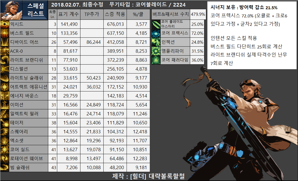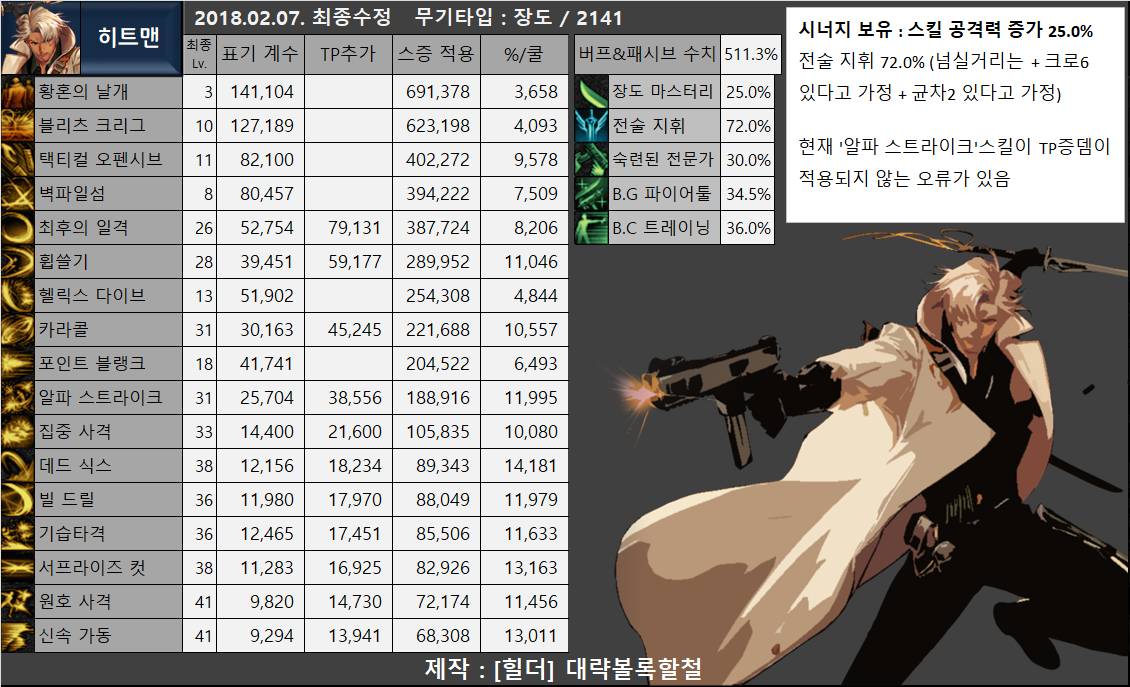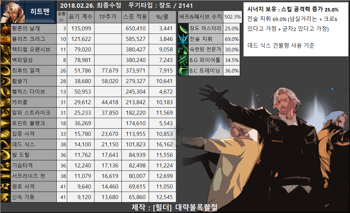 그 외에는 표기 계수는 하향되고 버프, 패시브 수치가 올랐기에 스증 적용된 계수는 표기계수의 하향폭에 따라 현상유지인 스킬도 있고 하향된 스킬도 있고 상향된 스킬도 있습니다. 이거 다 적기에는 너무 많고 그냥 예전 계수표 올려드림, 올린김에 히트맨도