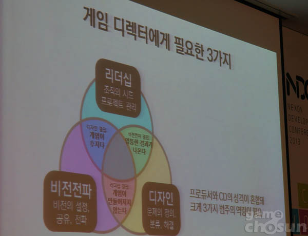이 디렉터는 게임디렉터가 갖춰야 할 역량으로 리더십과 비전 전파, 디자인 세 가지를 열거하며 이 가운데 리더십이 가장 중요하다고 주장했다.