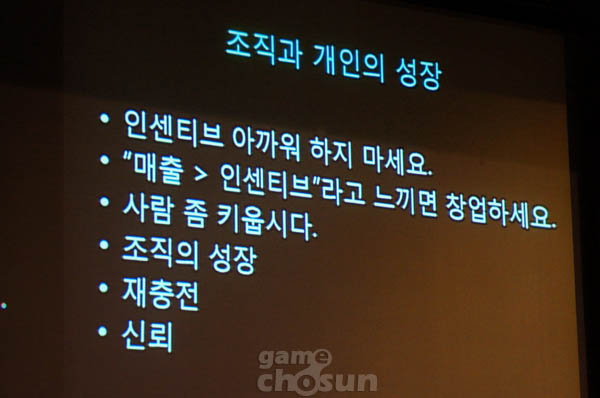결국 배 부사장은 한국 게임 업계는 생존을 위해 조직과 개인의 성장이 절실하며 이를 위해 무엇보다 '인력의 재충전'이 가장 중요하다고 말했다.