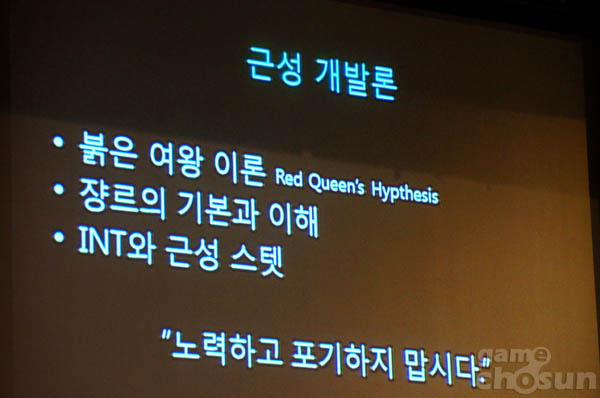 "PC플랫폼이 죽는다고 하지만 이 와중에도 PC 전체 시장은 성장하고 있듯 한국의 전체 게임시장도 성장 중이라 생각합니다. 과거 달라진 것은 플랫폼들이 세분화됐다는 점으로 어려움이 있지만 '붉은 여왕 이론'처럼 열심히 뛰면 제자리를 유지해 생존하는 것처럼 일명 근성 개발론으로 게임 개발에 모든 것을 걸고 포기하지 말고 열심히 노력하면 위기를 극복법을 찾을 수 있습니다"