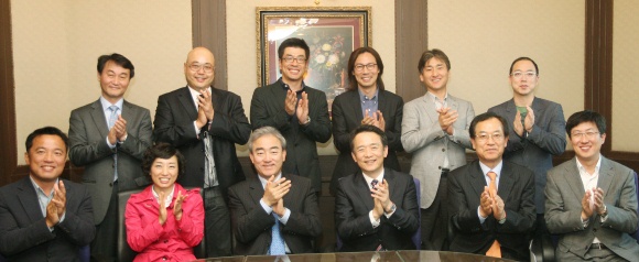 (좌측 상단부터 시계방향) 조영기 CJ E&M 넷마블 부문대표, 남궁훈 위메이드 대표, 강신철 네오플 대표, 이은상 NHN한게임 대표, 이기원 네오위즈게임즈 대표, 송병준 게임빌 대표, 양동기 스마일게이트 부사장, 신현택 게임문화재단 이사장, 남경필 한국게임산업협회 회장, 유진룡 장관, 박지영 컴투스 대표, 김택진 엔씨소프트 대표.
