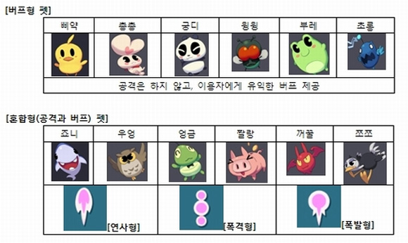펫은 유익한 버프를 통해 이용자들을 도와주는 버프형 펫, 지원 사격과 버프를 동시에 제공하는 혼합형 펫으로 나눠진다.