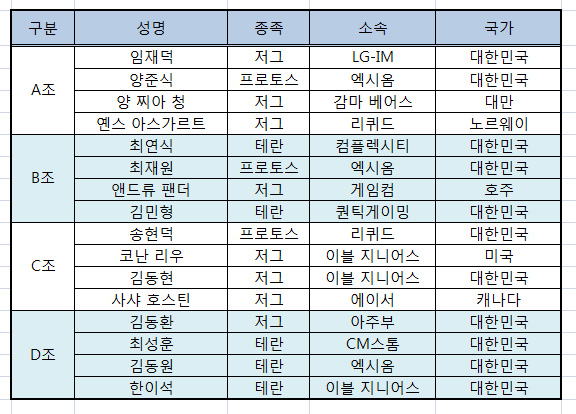 C조에는 송현덕과 김동현 등 프로리그 연합팀의 팀킬이 예상된다. 또한 나머지 두 자리에도 아시아계 미국인 코난 리우와 '스칼렛' 사샤 호스틴 등이 자리하고 있어 쉽지 않은 대결이 벌어질 전망이다.