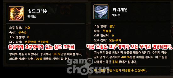 스킬 계승에서 방패를 사용하는 일부 특수 스킬을 제외하고는 대부분 요구 장비 제한이 완화돼 원거리 직업인 레인저의 스킬을 근접 캐릭터인 어새신이 선택할 수 있는 폭이 넓어졌다.