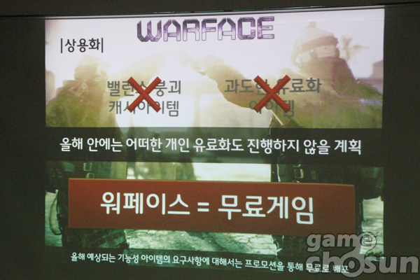 또한 회사측은 2013년 이후에도 '워페이스'는 게임의 밸런스를 붕괴시키는 아이템이나 과도한 현금 결제를 유도하는 아이템 출시는 없을 것이라고 전했다.