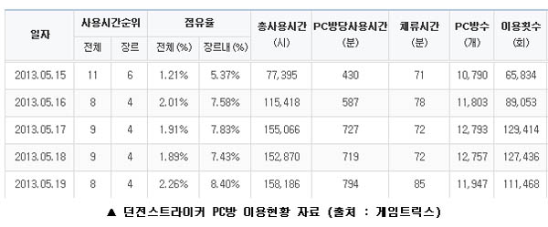 던스는 서비스 첫 날 1.21%의 점유율로 출발해 이튿날 2.01%를 달성했고 석가탄신일을 포함 3일 연휴에는 1.91%와 1.89%, 2.26%를 각각 기록하며 점유율은 일시적 하락 후 상승한 지표지만 PC방당 사용시간과 총사용시간은 꾸준히 증가했다.
