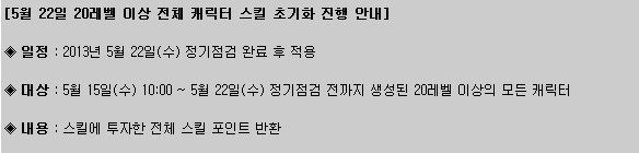 이번 스킬 초기화는 공개 서비스 이후 스킬 오류 및 버그로 인해 변경된 스킬 효과에 따른 것으로 20레벨 이상 모든 캐릭터의 스킬포인트가 반환될 예정이다. 즉 변경된 스킬 정보에 따라 의도치 않게 자신의 기술이 너프를 받은 게이머들의 피해를 인정하고 이를 바로 잡을 수 있는 기회를 제공하는 것.