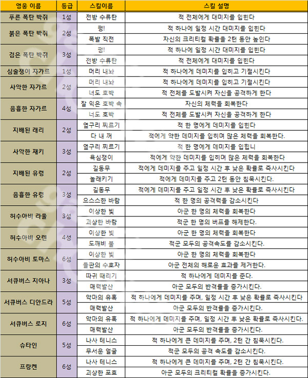 신규캐릭터는 1성부터 최고 등급인 6성까지 총 18종이 준비돼 있으며 개성 있는 외모와 스킬로 이용자들에게 호응을 이끌 것으로 보인다. 1성은 2종, 2성은 4종, 3성 5종, 4성 2종, 5성 2종이며 가장 희귀한 6성(레전드) 등급은 프랑켄, 서큐버스 로지, 허수아비 토마스 등 3종이다.