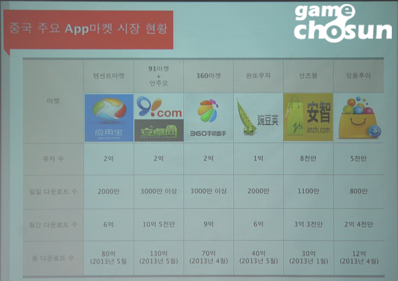 다만 중국의 경우, 구글의 정식 오픈마켓인 구글플레이 입점이 막혀 있는 터라 중국 시장 진출을 위해서는 100여개에 달하는 현지 로컬 안드로이드 마켓의 특성을 고려한 전략적 대응이 필요하다고 강조했다.