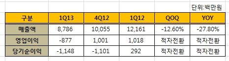 이는 지난해 같은 기간보다 매출액은 -27.8% 감소하고 영업이익과 당기순이익은 적자전환한 수치다.