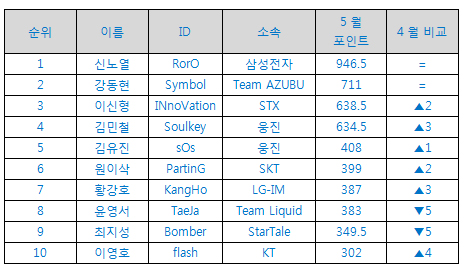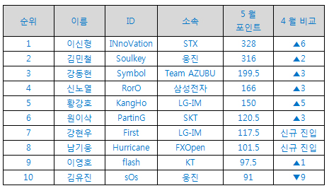 이스포츠 연맹 5월 랭킹에는 강현우(LG-IM, 프로토스)와 남기웅(FXOpen, 프로토스)이 10위권 내에 새롭게 진입하였고, 지난 4월 랭킹 1위였던 김유진(웅진, 프로토스)은 10위로 9계단 하락하였다.