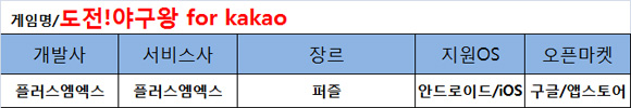 전국민 최고의 인기스포츠 야구. 우리는 류현진의 투구 하나하나에 온 정신을 집중하고 그의 역투에 환호를 보낸다. 또한 각자의 연고지나 좋아하는 선수에 따라 자신의 응원팀을 정하고 성원을 보낸다. 새롭게 출시된 '도전!야구왕'은 퍼즐게임을 즐기면서 자신이 좋아하는 팀과 선수를 응원하고 그선수의 활약에 따라 자신의 랭킹에 영향을 주는 신개념 퍼즐게임이다.