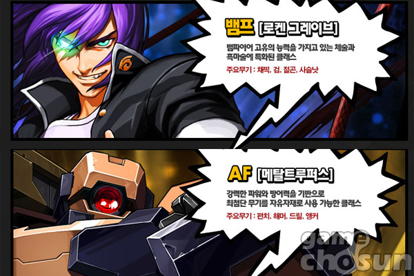 뱀파이어를 모티브로한 '뱀프'는 체술과 흑마술을 사용하며 전직을 통해 적을 속박하거나 마법을 자유자재로 사용할 수 있으며 채찍이나 절곤, 사슬낫을 무기로 사용한다. 'AF'는 기계로봇으로 해머와 드릴, 앵커 등 최첨단(?) 무기를 자유자재로 휘두르며 전직을 통해 근거리 또는 원거리에 특화된 캐릭터로 변신한다. 마지막 '검사'는 쉽게 접할 수 있던 직업이지만 전직을 통해 염력을 사용하거나 검기를 내뿜는 독자적인 캐릭터로 성장한다.