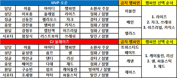 이와 반대로 오존은 상대에 비해 늦게 챔피언을 선택하는 빨강진영에 위치했기 때문에 최근 강세를 보이는 트페와 제이스를 금지했고 ‘플레임’ 이호종의 주력챔프인 케넨을 금지시킨다.