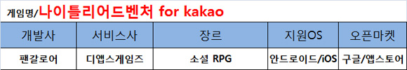 '나이틀리어드벤처'는 새로운 친구와의 파티플레이 등 함께 즐길 수 있는 요소들을 많이 갖추고 있다. 기존의 소셜 RPG는 단순히 육성과 경영을 진행하는 방식이라면 나이틀리어드벤처는 육성과 경영 뿐만 아니라 친구와 파티를 맺어서 플레이할 수 있는 파티플레이 시스템을 갖추고 있다는 것이 특징이다.