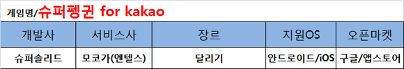 엔텔스의 모바일게임 브랜드 '모코가'가 '슈퍼펭귄 for Kakao(이하 슈퍼펭귄)'을 출시했다. '슈퍼펭귄'은 영국 개발사 슈퍼솔리드의 작품으로 문어에게 납치된 친구 펭귄들을 구출하는 것이 목표인 달리기게임이다.