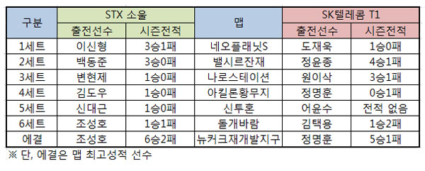 STX는 내심 4대0까지도 바라보고 제출한 엔트리로 보인다. 이신형이 초반 상승세를 이끌고 각 맵에서 최적화된 선수들이 바통을 이어받길 기다리는 형국이기 때문이다. 반면 SK텔레콤은 도재욱과 정윤종의 깜짝 전략이 없다면 다소 긴 호흡으로 경기를 이끌만한 엔트리가 됐다.