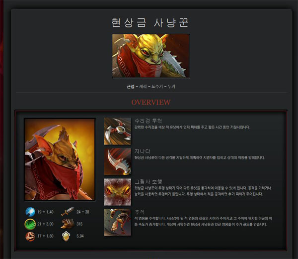 이렇듯 현상금 사냥꾼은 궁극기가 공격을 할 수 있는 것이 아니라 약해 보이 수 있으나 기본 능력치가 암살 영웅 중 우수한 편이고, 힘과 지능도 균형을 이루고 있어 밸런스가 좋은 영웅이다.