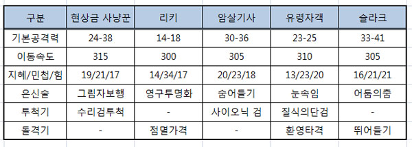 암살기사는 암살 영웅 중 딱 중간 정도의 능력치를 갖고 있다. 기본 공격력이 30-36으로 슬라크, 현상금 사냥꾼이 비해 낮으나 리키나 유령자객보다 높다. 또한 최저 공격과 최고 공격의 차가 불과 6으로 비교적 안정적인 공격력을 갖고 있다.