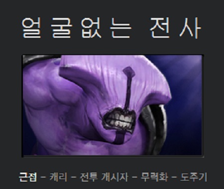 얼굴없는전사는 수비력이 다소 약한 주능력이 민첩인 캐리이지만 뛰어난 궁극기와 패시브 스킬로 한타의 중심에 설 수 있는 영웅이다. 이 영웅의 궁극기 '시간의구슬'은 자신 주변 ~범위의 모든 유닛(타워와 크립, 아군 포함)을 정지시키고 자신만 움직일 수 있게 하는 스킬이다. 이 때문에 아군을 죽음으로 몰아갈 수도 있고 대승을 거둘 수 있게 할 수 있는 양면성을 가지고 있다.