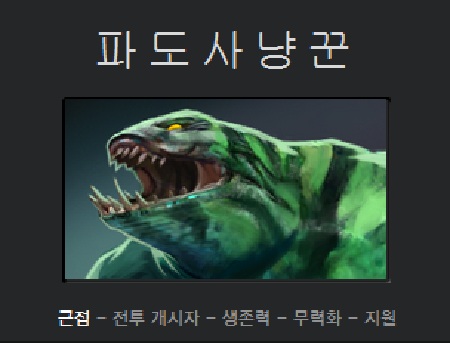 파도사냥꾼은 롤의 '말파이트'를 연상케하는 스킬들이 많아 롤 유저들에게 친숙한 느낌을 주는 영웅이다. 분출(Q스킬)은 적 유닛에게 물살을 뿜어내 이동속도와 방어력을 감소시키는 스킬이다. 크라켄껍질(W스킬)은 말파이트의 화강암방패(패시브)를 연상시키는 스킬로 600의 피해동안 자신이 받는 피해량을 감소시켜준다.