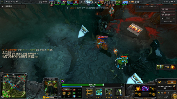 이후로도 김병훈은 상단과 하단에서 적 크립을 사냥했고 로샨 앞에서의 전투 상황에도 적 본진을 휩쓸었다. 이어서 하단에 모두 모인 EOT는 하단과 중앙 포탑을 차례로 파괴하며 항복을 받아냈다.