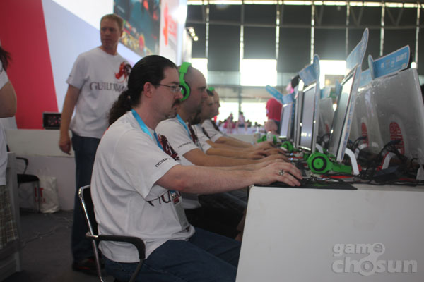 '길드워2' 시연대는 무대 옆과 부스 안 두 곳에 마련됐고 무대 옆 시연석에서는 아레나넷의 개발자들 관람객과 5:5로 대결을 펼치는 이벤트도 진행돼 눈길을 끌었다.