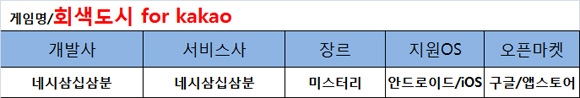 '회색도시 for Kakao'는 '네시삼십삼분'의 야심작으로 유괴 사건을 시작으로 연이어 벌어지는 살인 사건과 그 뒤에 숨겨진 진실을 추리하는 게임이다.