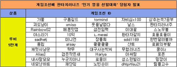 지난 7월 24일부터 31일까지 게임조선에서 진행한 모바일게임 '판타지러너즈 for kakao' 인기 영웅 선발대회 이벤트 당첨자를 발표합니다.