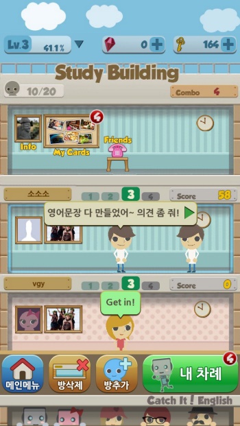 ‘캐치잇잉글리시’는 영어문장카드를 친구와 주고받으며 문제를 맞혀 점수를 쌓는 방식으로 학습이 진행된다. 페이스북 등을 통해 친구를 초대할 수 있는 것은 물론 자신의 문제만 맞히는 것이 아니라 친구가 문제 푸는 것을 도와주면서 공동의 점수를 획득할 수 있다.