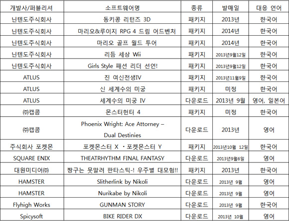 더불어 닌텐도 e숍을 통해 스퀘어에닉스의 '씨어트리듬 파이널 판타지', 아틀러스의 '세계수의 미궁 Ⅳ'와 캡콤의 '역전재판 영문판' 등을 외국어 다운로드 소프트웨어로 발매할 계획이다.