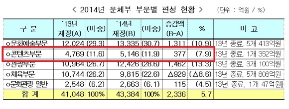 문화부는 1일 종로구 청사에서 '2014년 예산 편성안' 브리핑을 갖고, 내년도 예산 2조2837억원, 기금 2조547억원 등 총 4조3384억원의 살림에서 11.9%를 콘텐츠산업 육성을 위해 투자할 방침이라고 밝혔다.