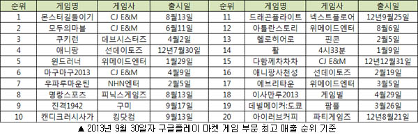 지난 9월 30일 자 구글 플레이마켓 게임 부문 최고 매출 순위 TOP20을 보면 최근 동시접속자 30만명을 기록한 것으로 알려진 ‘몬스터길들이기 for kakako’가 꾸준히 1위를 유지하고 있는 가운데 모두의마블-쿠키런-애니팡-윈드러너 등 1000만 다운로드를 넘어선 게임들이 상위권을 형성하고 있다.