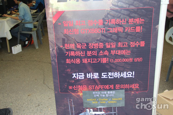 월드오브탱크를 체험하며 일일 최고 점수를 기록한 일반인에게는 최신형 그래픽 카드, 현역 군인에게는 소속 부대에 100만원 상당의 회식용 돼지고기가 지급됐다. 이 외에도 참가자 전원에게는 게임 내에서 사용할 수 있는 아이템 쿠폰도 전달됐다.