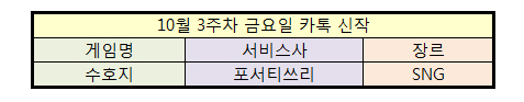 10월 3주차 금요일 카카오 게임하기 플랫폼을 통해 출시된 신작은 SNG(사회관계망게임) 1종 뿐이다. 네시삼십삼분의 '수호지 for Kakao(이하 수호지)'만 단독으로 선보인 것.