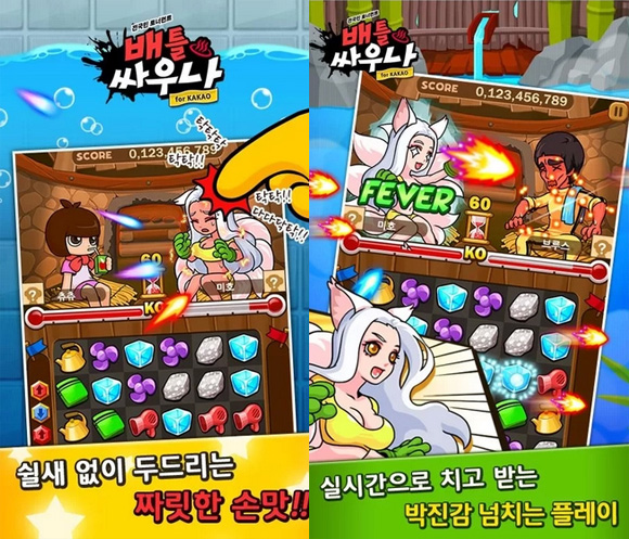 플레이위드가 선보인 '배틀싸우나'는 뜨거운 사우나 속에서 싸우는 유저 간 대결을 그렸다. 실시간 일대일 대결로 진행되는 '배틀싸우나'는 헤어드라이어, 뜨거운 돌 등을 세 개 이상 맞춰 없애면 상대를 덥게 만들 수 있다.