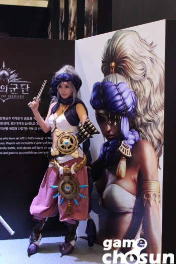 지스타 첫날 넥슨 부스에는 '영웅의 군단' 캐릭터로 분한 모델들이 포즈를 취하고 있다.