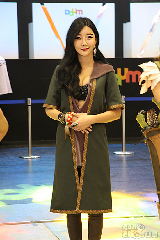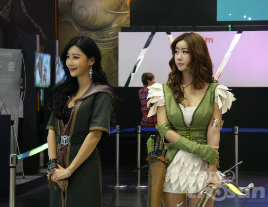 검은사막을 전시한 B2C부스에는 부스걸들이 게임 내 캐릭터인 레인저와 소서러 코스튬플레이(코스프레)를 선보였다.