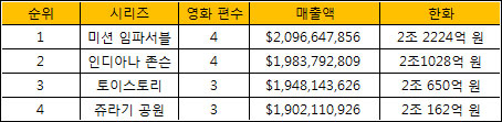 헐리우드 시리즈 영화와 비교해도 '리니지'의 2조 매출은 뒤쳐지지 않는다. 총 4편인 '미션임파서블' 시리지는 4년간 약 2조 2000억 원을 올리고 있으며 '인디아나존스'는 2조 1천억, '토이스토리' 약 2조 원, '쥬라기공원'은 약 2조원 등의 매출고를 올렸다.
