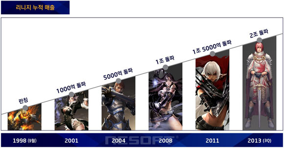'리니지'는 2013년 누적 매출 2조원을 달성한다. 국내 천만 관객 영화 9편을 모두 더한 매출액이 약 7790억 원인 것을 감안하면 막대한 금액이다. 또 대표적 한류 콘텐츠 기업 SM엔터테인먼트의 지난해 매출 1686억임에 비해 '리니지'는 그보다 많은 2049억 원을 기록했다.