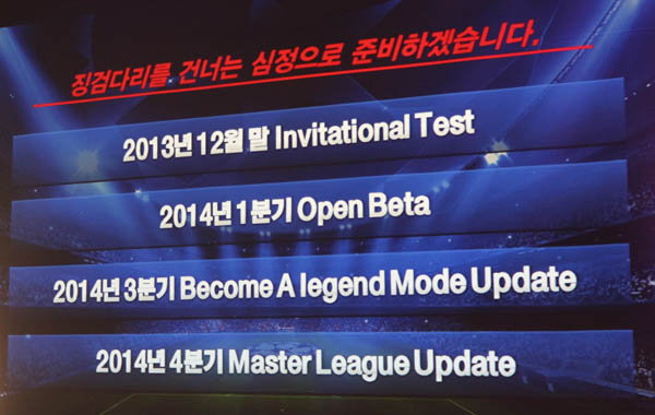 덧붙여 우 이사는 "오픈베타테스트를 2014년 1분기로 잡은 것은 이보다 늦어지면 브라질 월드컵 특수도 놓칠뿐더러, 유저들 입장에서도 게임을 기다리다 지칠수 있기 때문이다."라며 내년 1분기안에 되도록이면 빨리 OBT를 진행할 계획임을 밝혔다.