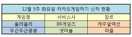 12월 다섯째 주 화요일 카카오톡 게임하기 신작은 안드로이드에서만 2종 출시됐다. 액션을 강조한 점핑 게임 '올라올라'와 퍼즐과 이성친구 추천이라는 솔로 탈출의 기회를 주고 있는 '두근두근콩콩'이 그 주인공이다.