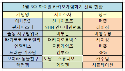 1월 세번째 주 화요일 카카오톡 게임하기에 모습을 보인 신작은 카톡게임의 최대 수혜자 선데이토즈의 '애니팡2'를 비롯해 총 8종의 게임이 출시됐다. 하지만 애니팡2의 캔디 크러쉬 사가 표절 논란으로 인해 다른 신작들이 선의의 피해를 입을 것으로 예상된다.