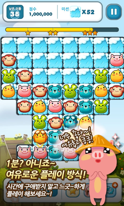 '모여라 동물친구'를 한 줄로 설명한다면 3D 벽돌깨기 동물 버전이라고 할 수 있다. 단순히 공만 왔다갔다하는 벽돌깨기 게임을 동물 캐릭터로 바꿔 귀여움을 더했다. 또한 학교 친구들과 협동하는 소셜 기능을 더해 색다른 재미를 더하고 있다.