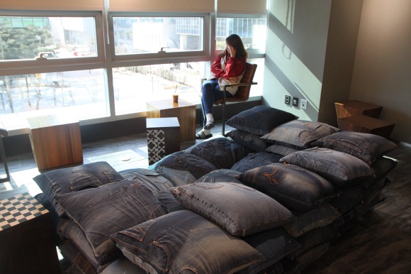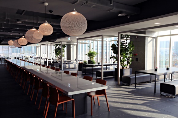 우선 사무공간의 경우 개인업무를 위한 전용면적을 기존 강남 사옥 대비 약 2배 넓게 책정했다. 또 업무 집중도 향상과 눈 피로도 저하를 위해 사무공간 전체를 LED조명으로 교체했다.