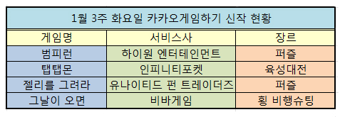 1월 세번째 주 금요일 카카오톡 게임하기에는 톡톡 튀는 아이디어의 게임들이 등장했다. 특히 테트리스지만 테트리스가 아닌 '젤리를 그려라'는 '유사한 게임'이 어떤 것인지 잘 보여주고 있다. 또한 미리내 게임즈에서 내놓은 신작 그날이 오면은 추억에 빠지기 충분한 게임이다.